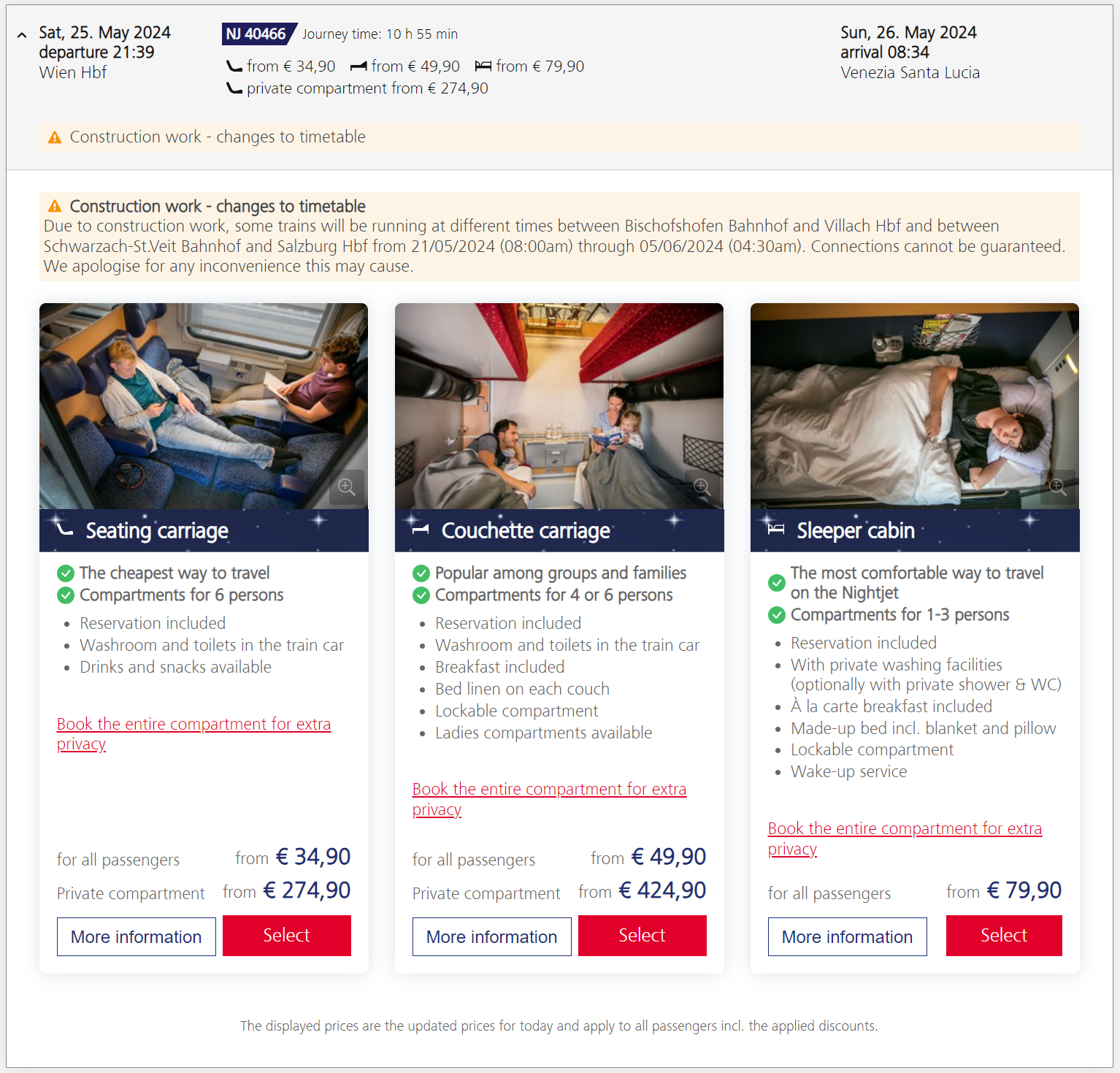 Pokud se rozhodnete pro cestu do Benátek vlakem, budete mít na výběr mezi několika možnostmi cestování. Nejlevnější volbou je cesta na sedačce, která je vhodná pro ty, kteří nepotřebují extra pohodlí. Další variantou je cesta v lehátkovém voze, který je rozdělený na 4 a 6 místné kupé. Tyto lehátkové vozy nejsou vybaveny sprchou, ale poskytují relativní dostatek prostoru pro cestující. Pro ty, kteří touží po větším komfortu a prostoru, je tu možnost cestovat v lůžkovém voze, kde si můžete vybrat mezi 3 místným, dvoumístným nebo single lůžkem. Tyto lůžkové vozy jsou vybaveny sprchou (společná ve vozy a ve vybraných deluxe kupé přímo ve vašem kupé) a také poskytují skvělou snídani pro cestující, více místa a kvalitní lůžkoviny.