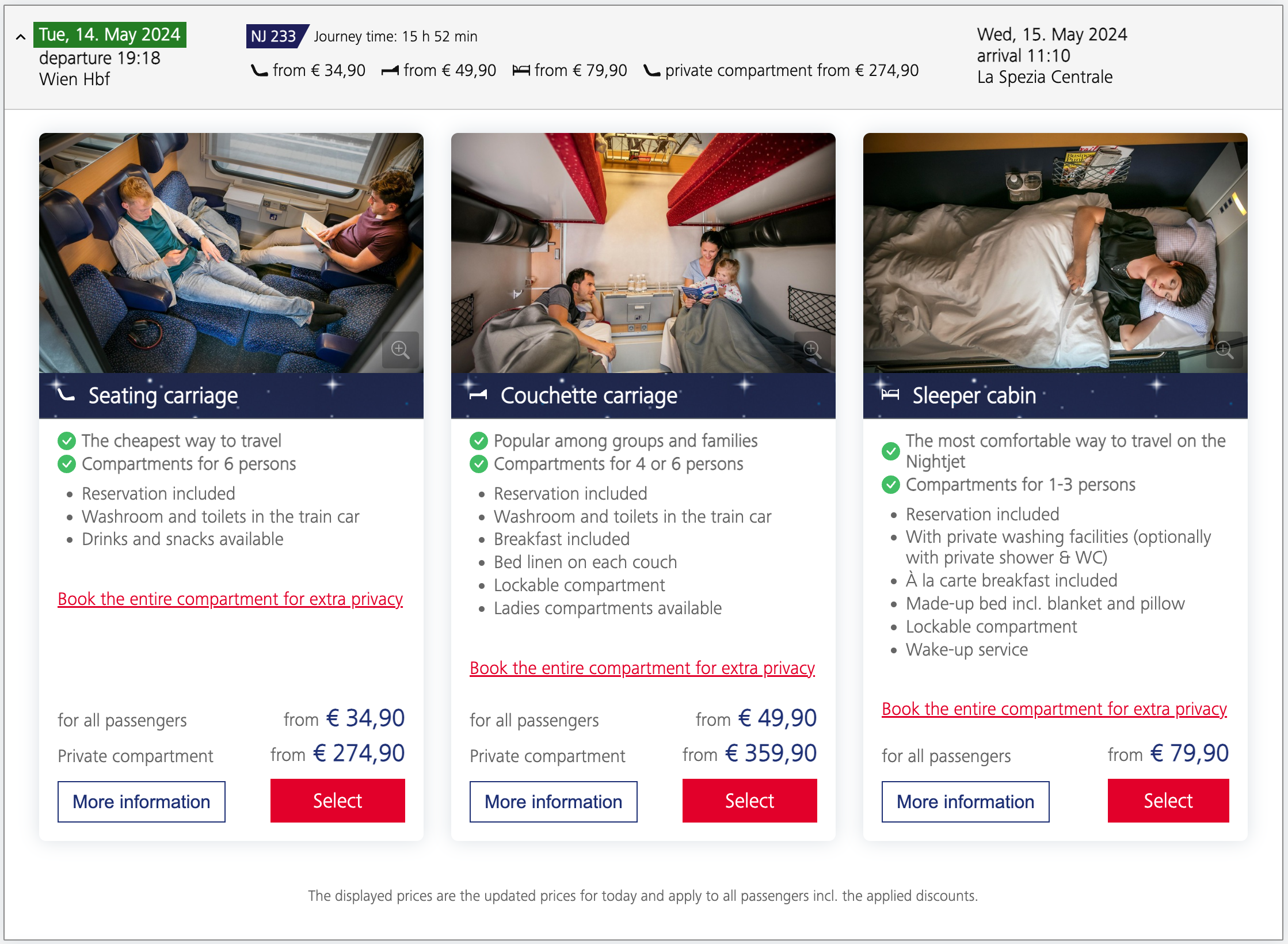 Tak jako u ostatních nočních vlaků, které provozuje Rakouské ÖBB máte k dispozici komfortní lůžkové a lehátkové vozy a také vozy k sezení. Spoje jsou provozovány denně.