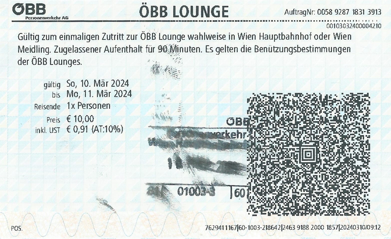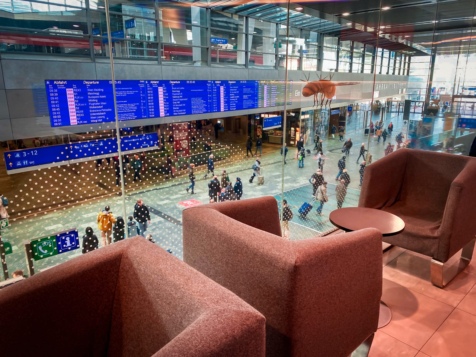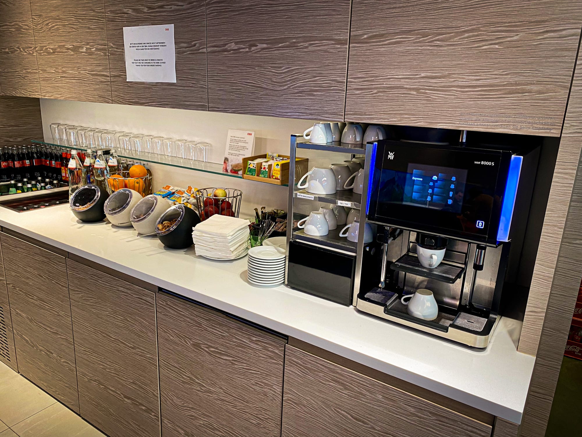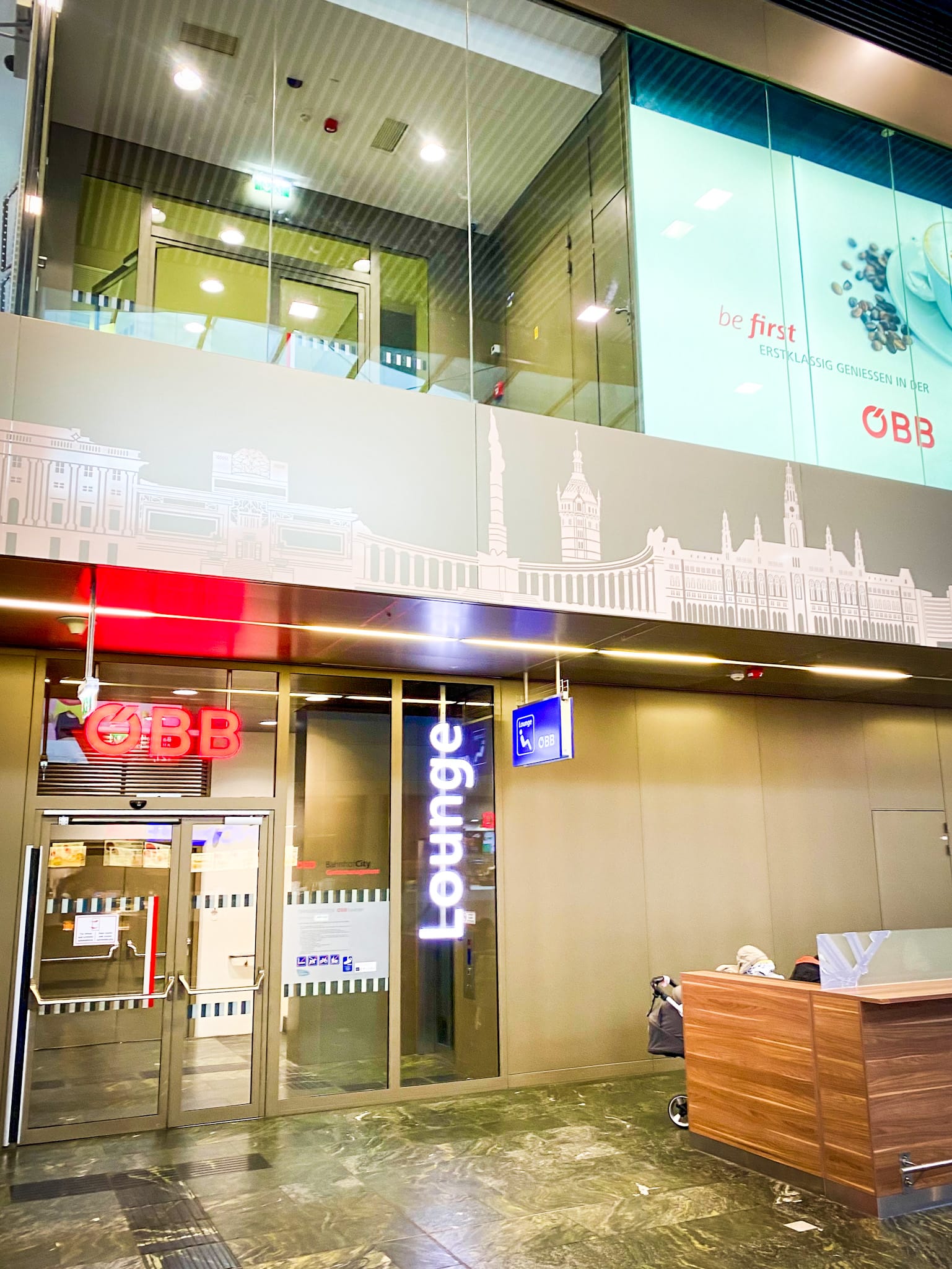 Máme asi 5 minut na přestup. Jelikož většinou přestup nestíhám, už rovnou jsem řekl, že půjdeme ve Vídni na snídani. Pro cestující nightjetu s lůžkem je k dispozici po příjezdu a před odjezdem Lounge ÖBB. S lehátkem jsem to ještě nezkoušel, tak to jdeme zjistit. Pán na recepci lounge nám říká, že tato jízdenka tu neplatí, ale že je možno si za 10€ lounge dokoupit. Toho využíváme - tyto salónky nabízejí kafe, nealko, ovoce a záchody. Zde počkáme na další spoj do Prahy.