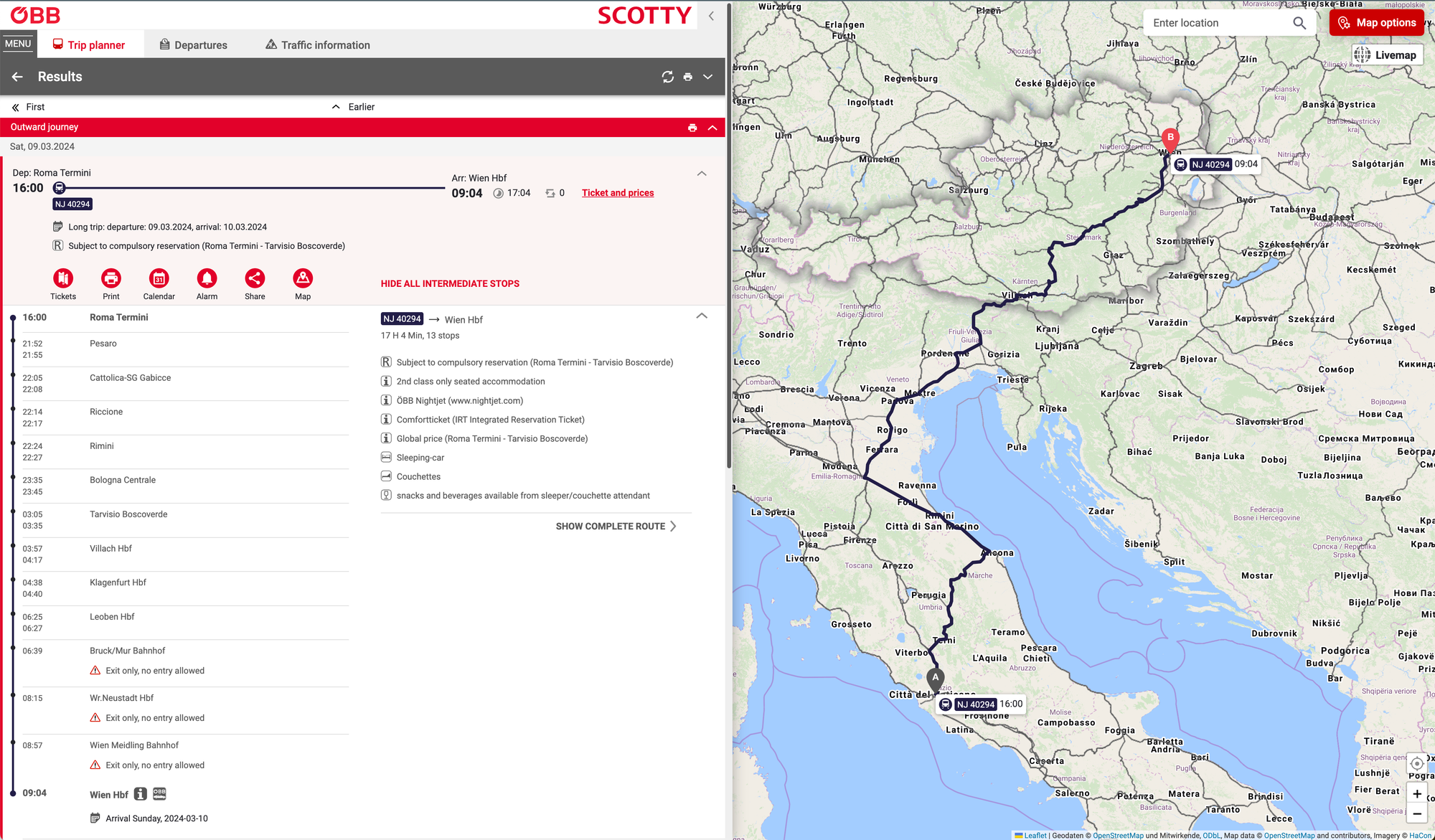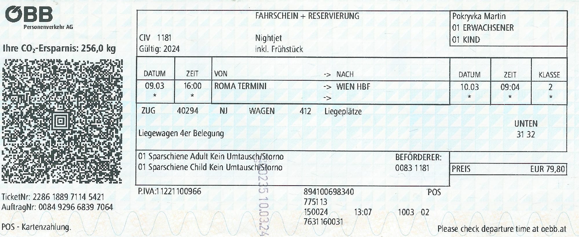 Čas odjedzu, který byl z 19 a 20 hodiny přesunut na 16 hodinu nebyl jedinou komplikací na této části cesty. První komplikace přišla při zakoupení jízdenky. Pokud je na této trase plánována výluka, která zásadně ovlivní jízdní řád a hrozí změna času odjezdu, je (v březnu 2024) jedinou možností zakoupení jízdenek stránka https://www.nightjet.com/ . Zde jde jízdenky zakoupit s povinností zadat telefonní číslo, kam vám před odjezdem přijde informace, zda se odjezd změnil. Ostatní prodejní kanály jako eshop ÖBB, eshop ČD ani pokladna ČD vám tyto jízdenky nevydá. Chtěl jsem dvě lehátka v 4 místném kupé, kdy obě lehátka budou dole. Na eshopu si sice můžete vybrat, že preferujete místa dole, ale nejsou garantovaná a ani vám před zaplacení nenapíšou, která místa jste dostali. Zbyla mi tedy jediná možnost, a to vydat se osobně na pokladnu do Rakouska. Jelikož jsem měl plánovanou cestu do Brna, odskočil jsem si do Vídně. Tam jsem dostal, co jsem chtěl. Za 80€ dvě lehátka (pro dospělého a dítě). Myslím, že toto by drtivou většinu od cesty odradilo a koupil by si letenky...