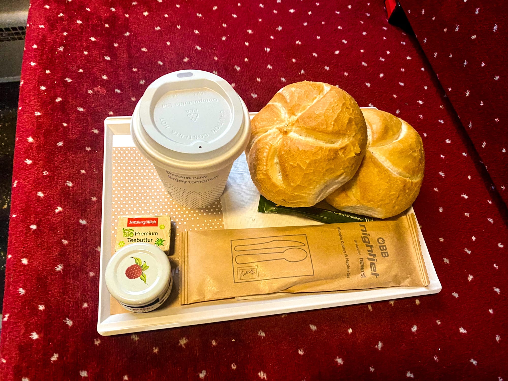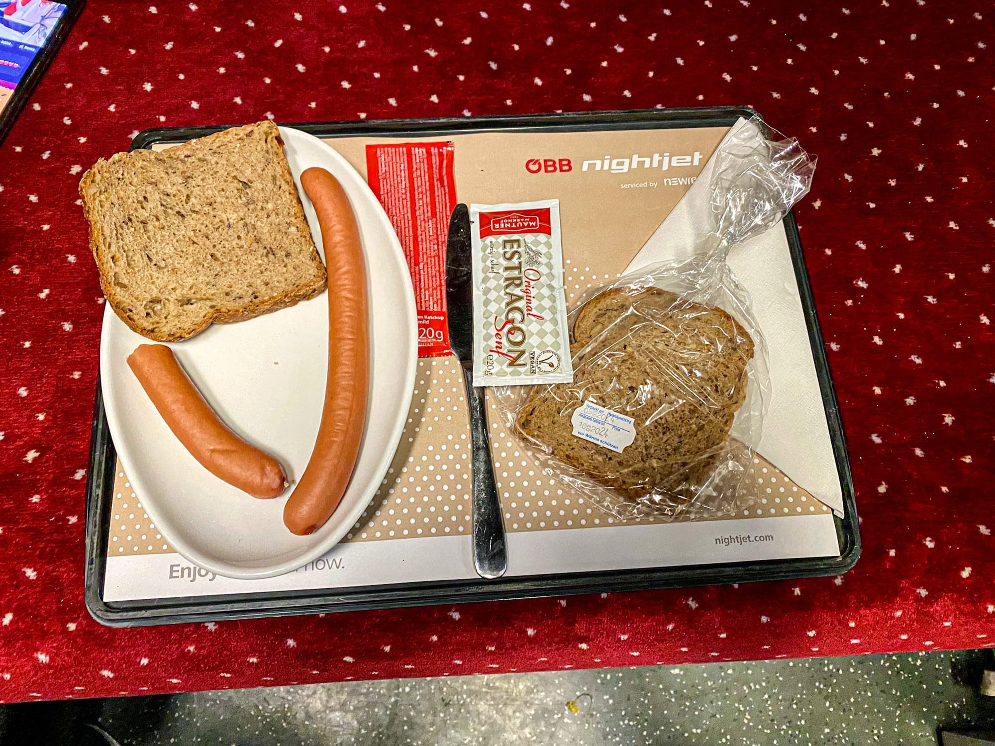 Snídaně (sladká) obsahuje kaiserku, džem a máslo. Dále teplý nápoj a džus. Lehátka nemají sprchy, ale vedle je lůžkový vůz, který sprchu má. Palubní personál je v lůžku a do lehátka dochází. Ptám se, jestli bude ok si dát vedle sprchu a steward s tím nemá problém. Takže po rychlé sprše za chvíli a včas vystupujeme ve Vídni.