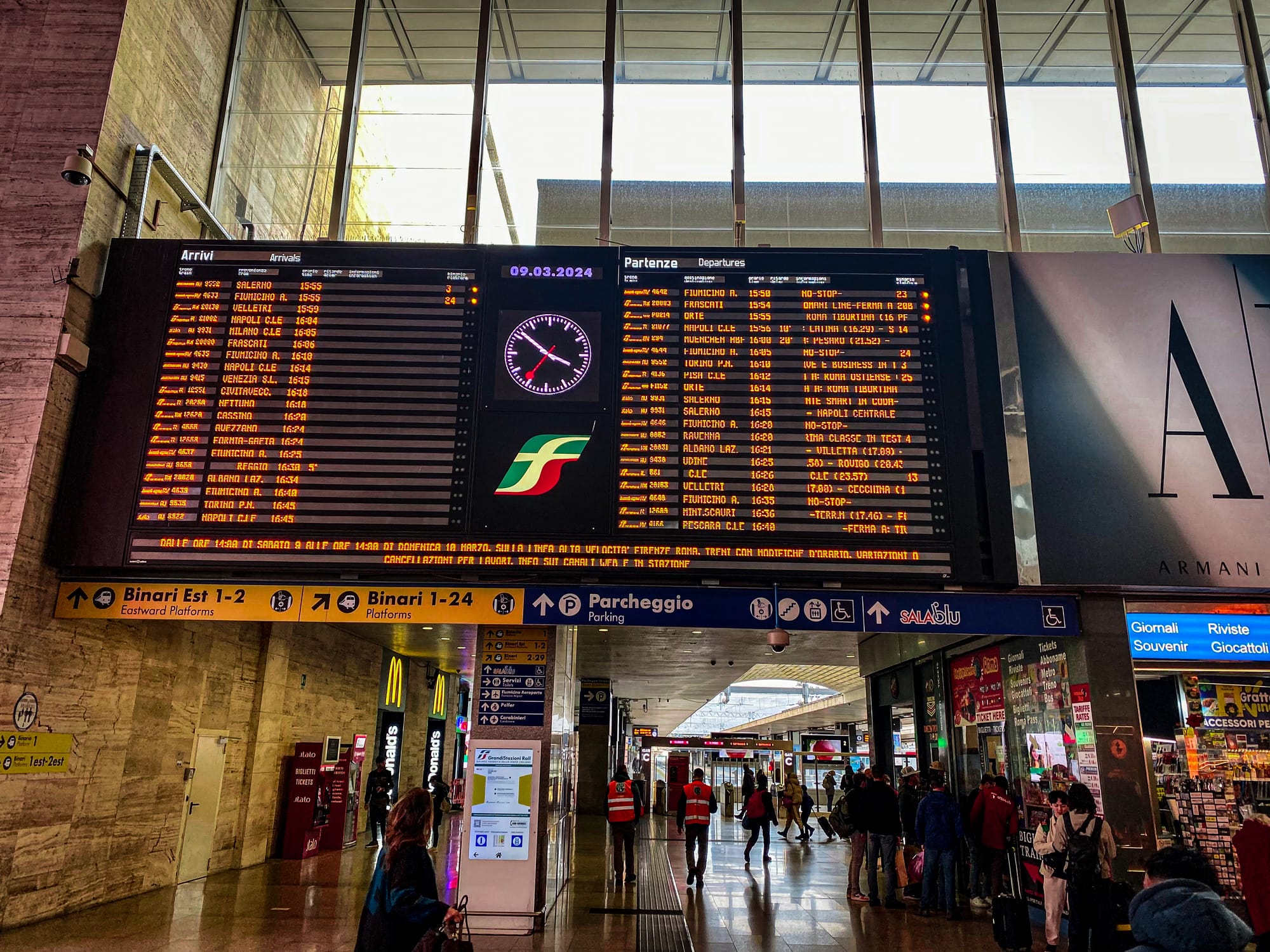 Pár minut před 16 hodinou náma ještě náš vlak určené nástupiště, což neznamená nic jiného než zpoždění. Stejnou zkušenost mám z posledních 3 předchozích cest z Říma. Nikdy se mi nepodařilo odjed s menším zpožděním než 45 minut.